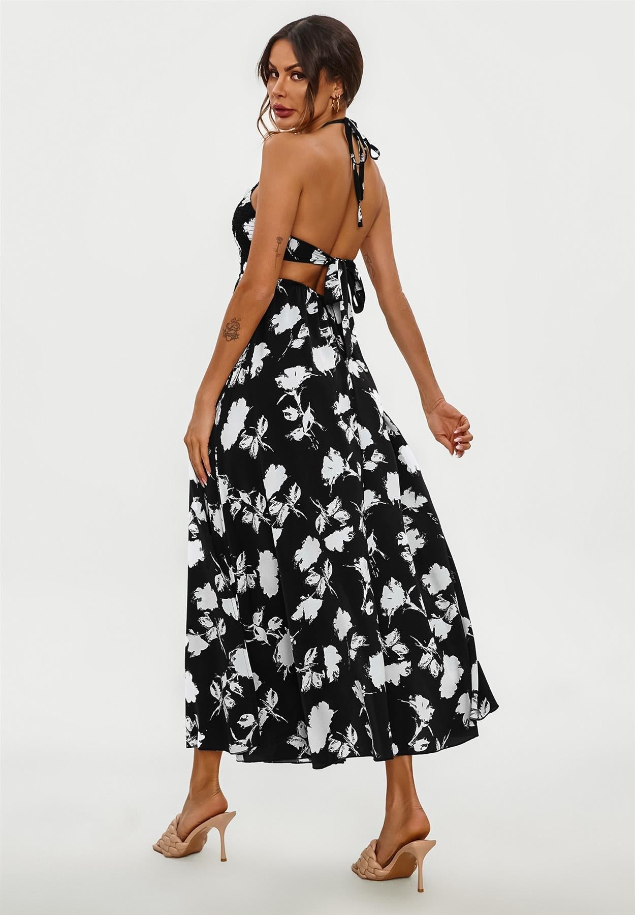Introducing our Floral Print Tie Halterneck Back Detail Maxi Dress in Black with Split Leg, a stunning addition to your summer wardrobe. This dress features a vibrant floral print that adds a pop of color to your ensemble, while the tie halterneck back detail offers a touch of elegance. The split leg design adds a playful element, allowing you to show off some skin while maintaining a chic and sophisticated look. Made from lightweight and breathable fabric, this maxi dress is perfect for warm weather days and can be dressed up or down for any occasion. Whether you're heading to a beach party or a summer wedding, this dress is sure to make you stand out in style. - Perfect for after-hours - Perfect for beach holiday - Perfect for fancy - Engagement Party - Perfect for casual occasions & wedding guest