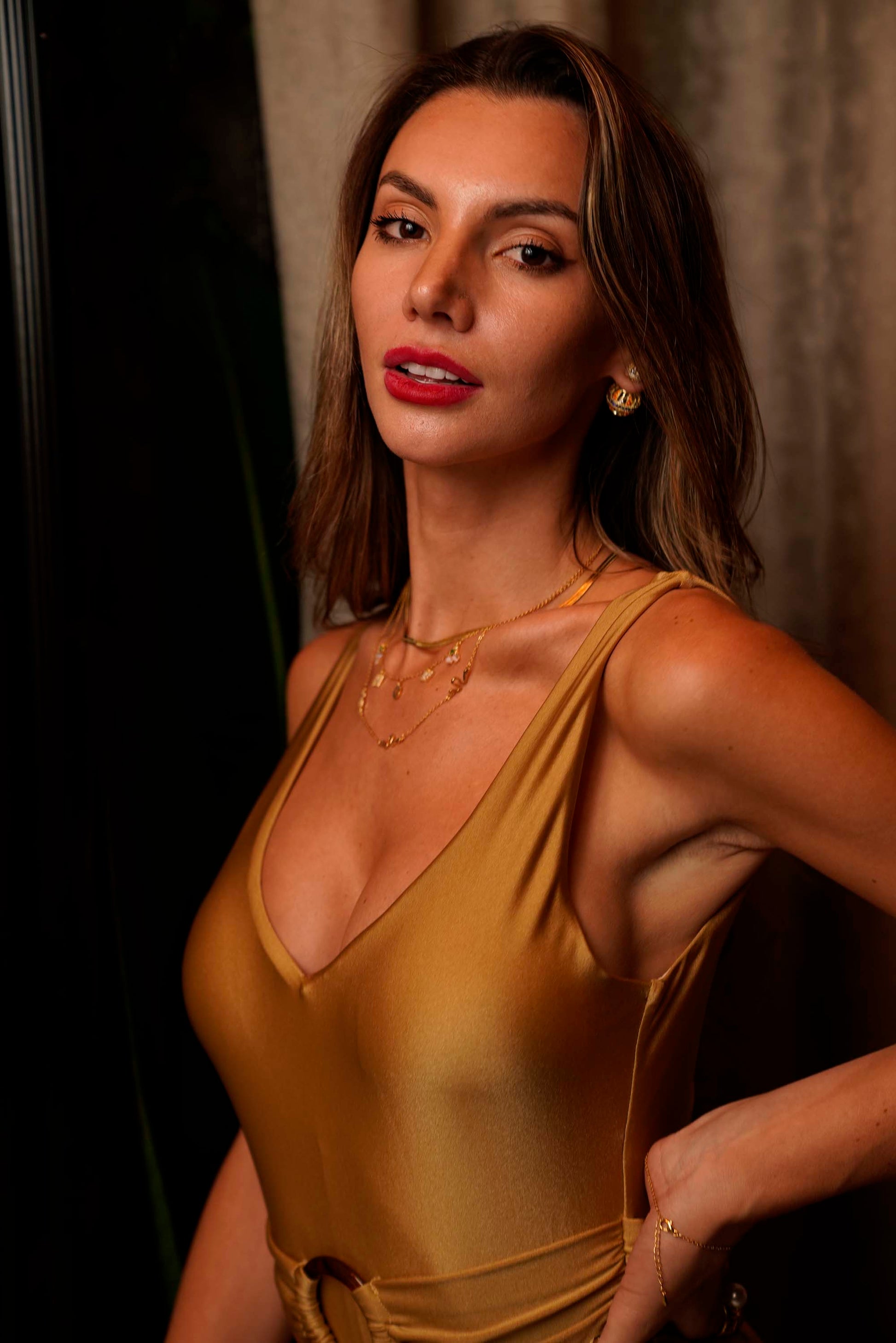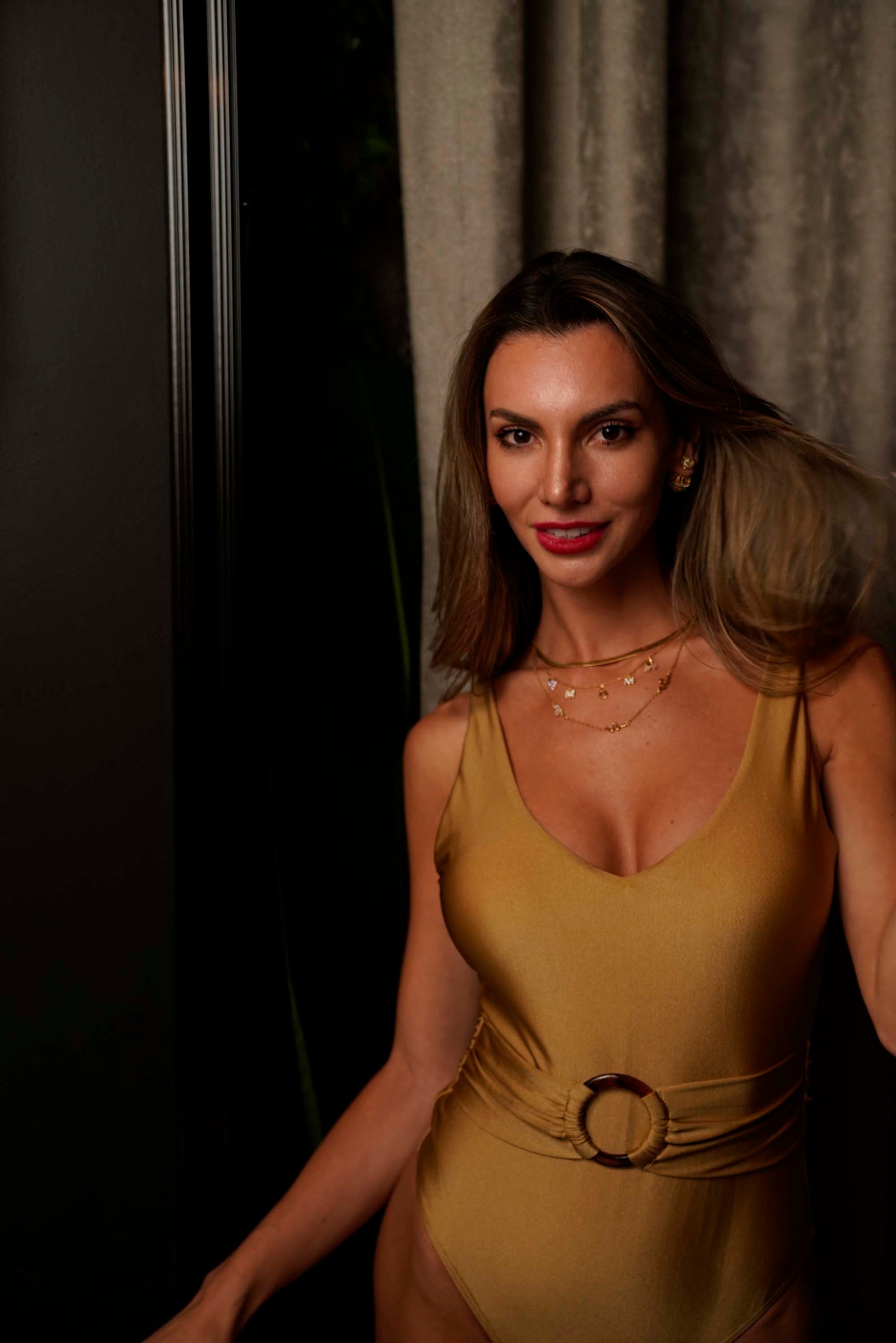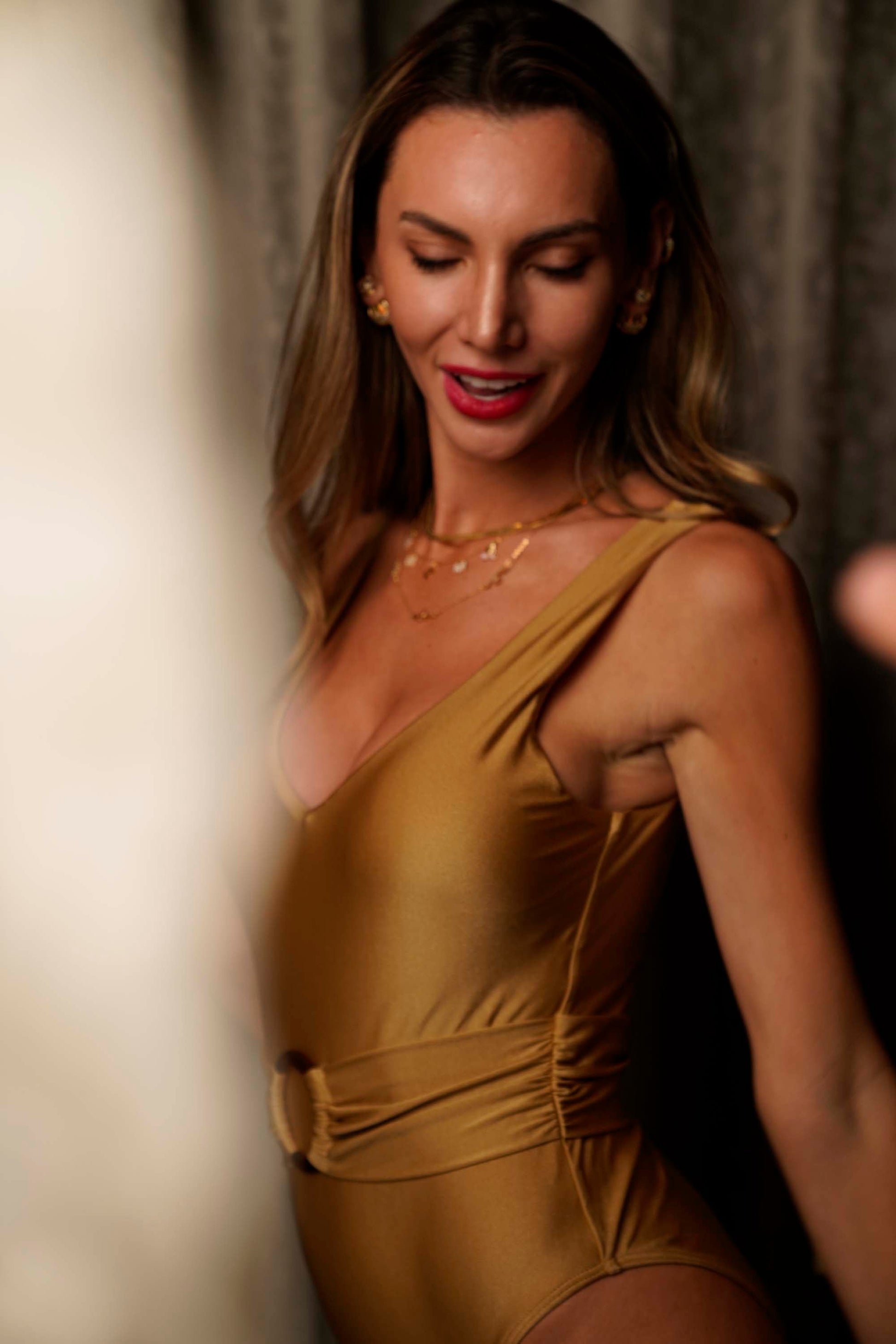 padded cups, attached wait belt with acrylic ring accent. Stretch material and fit.